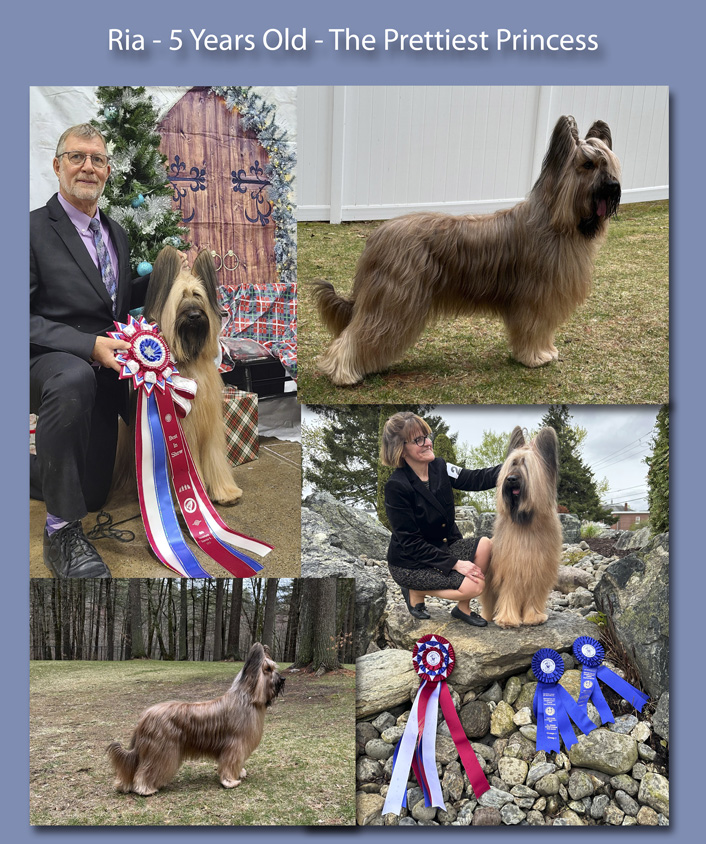 In 2024, Ria continued to be shown at low frequency and she continued to shine in the group ring, where she caught the eyes of the judges. Ria finished the year as the #1 Briard all breed, winning one more BIS in an incredibly beautiful line up, several more RBIS and of course many group ribbons. We are so very proud of all that Ria has accomplished, in the very tough north east competition. She is simply a spectacular girl inside and outside.